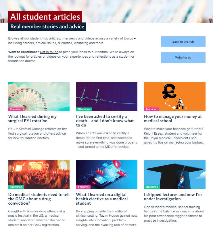 As Digital Editor at the Medical Defence Union, I commissioned and edited monthly text and video content for medical students – covering advice, dilemmas and features. Some of the most popular pieces: